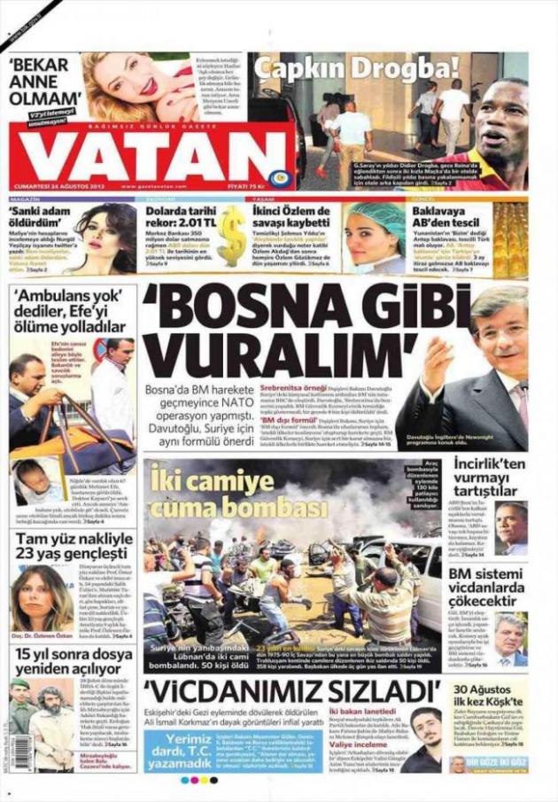 Η τουρκική εφημερίδα Vatan που φιλοξενεί τις δηλώσεις Νταβούτογλου έχει ως τίτλο « να χτυπήσουμε όπως και τη Βοσνία» και αναφέρει πως ο τούρκος υπουργός προειδοποιεί πως στη Σρεμπένιτσα 8000 άνθρωποι σκοτώθηκαν μέσα σε μια νύχτα λόγω της αναποφασιστικότητας του ΟΗΕ.
