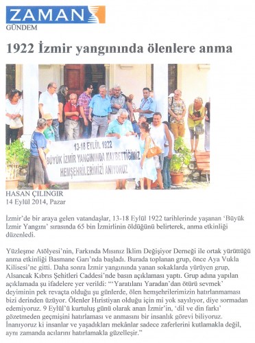 Όπως αναφέρεται σε ένα πραγματικά εκπληκτικό δημοσίευμα της μεγαλύτερης κυκλοφορίας τουρκικής εφημερίδας, Zaman, έγινε στην Σμύρνη, (ακούστε κύριοι τουρκολάγνοι), τελετή για τα θύματα της μεγάλης πυρκαγιάς και της σφαγής των χριστιανών της ιστορικής ελληνικής πόλης κατά τα γεγονότα του 1922! Το πιο εντυπωσιακό στην τελετή αυτή, είναι ότι αναρτήθηκε και πανό το οποίο έγραφε στα τουρκικά, «13-18 Σεπτεμβρίου 1922. Τιμούμε την μνήμη των απολεσθέντων συντρόφων μας κατά την πυρκαγιά της Σμύρνης». Η τελετή μνήμης των θυμάτων της καταστροφής της Σμύρνης και της απώλειας των χριστιανών κατοίκων της, που πέρασαν τα χίλια μύρια από την μεγάλη σφαγή και την γενοκτονία του ελληνισμού της Ανατολής, έγινε στον ιστορικό σταθμό Basmane της πόλης, ενώ ένα γκρουπ από αυτούς που τίμησαν την μνήμη των θυμάτων της σφαγής, έκαναν και μια μικρή πορεία με το πανό που αναφέραμε παραπάνω. Οι τιμώντες την μνήμη των θυμάτων, αναφέρεται ότι θεώρησαν υποχρέωση και καθήκον τους τνα κάνουν μια μικρή έστω τελετή για να τιμήσουν τα θύματα της μεγάλης πυρκαγιάς που κατέστρεψε την παλιά Σμύρνη, όπου ζούσαν και οι χριστιανοί κάτοικοι, δηλαδή οι Έλληνες που εξοντωθήκαν από την μεγάλη σφαγή και την γενοκτονία των χριστιανών της Ανατολής. Πρόσθεσαν δε το εντυπωσιακό για Τούρκους, πως τις μέρες αυτές δεν πρέπει μόνο να κάνουμε λαμπρές τελετές για την επέλαση του κεμαλικού στρατού προς την Σμύρνη, αλλά να θυμόμαστε και τα θύματα που επισώρευσε αυτή η επέλαση. Με λίγα λόγια να τιμήσουμε τα θύματα της μεγάλης σφαγής της Σμύρνης.