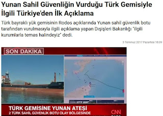 Το δημοσίευμα σχολιάζει ότι 'υπάρχει ο ισχυρισμός ότι η ελληνική ακτοφυλακή άνοιξε πυρ κατά του τουρκικού πλοίου, όταν αυτό δεν υπάκουσε σε εντολή'- αφού προφανώς βρισκόταν σε ελληνικά χωρικά ύδατα.